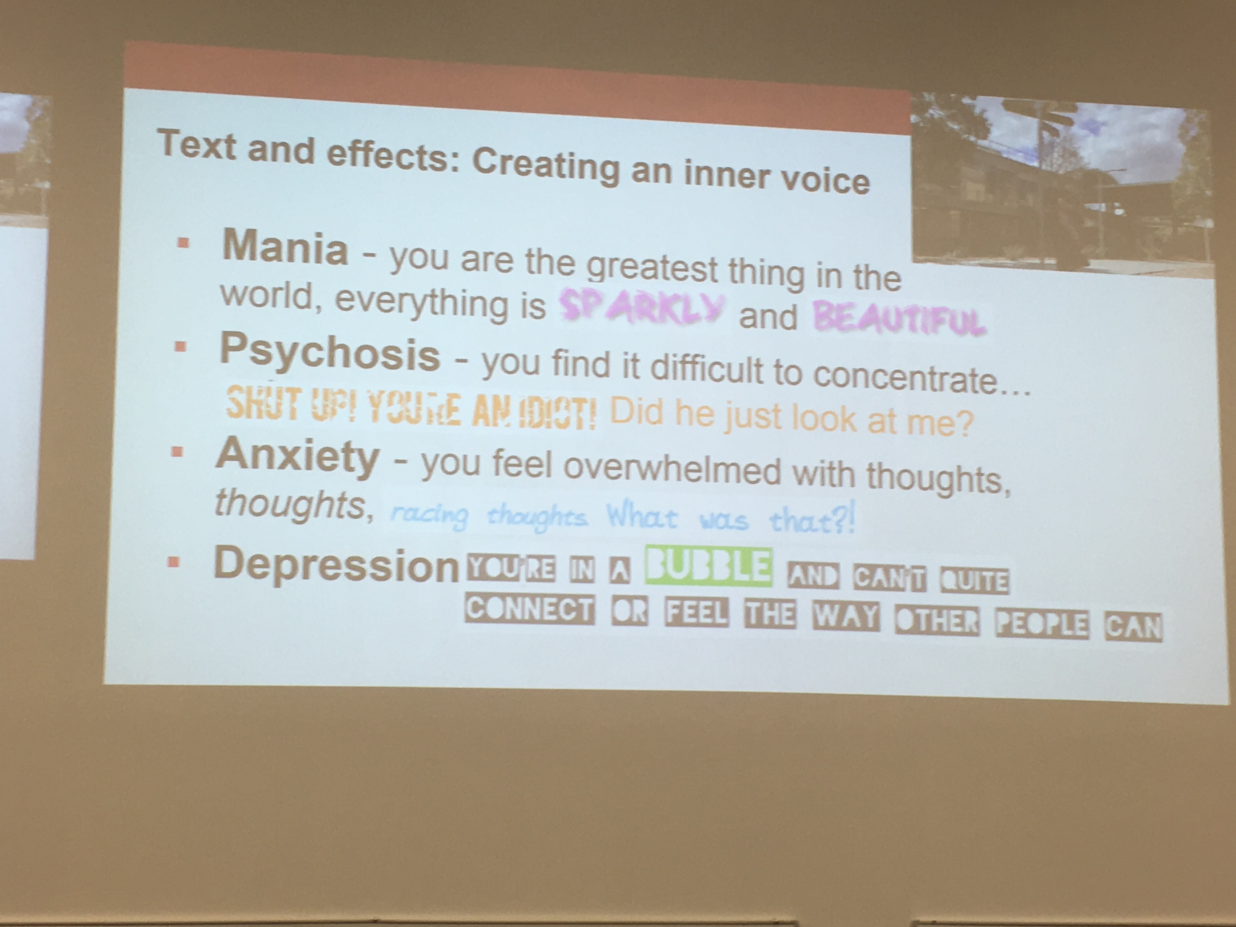 The first talk I attended was by Lorna Saunder from City, University of London who dicussed the use of VR to develop empathy and understanding of mental health experiences. Lorna used 360 videos with text overlays to simulate the feeling of various mental health conditions including mania, psychosis, anxiety and depression. The text appeared within the view of the viewer and was made up of words that represent the internal thoughts of a person. The font used was chosen to further represent the thoughts and mental health condition. Audio was purposely not used as it was felt that the student would have a more authentic experience if their own inner voice read the text rather than a different voice read the words to them.